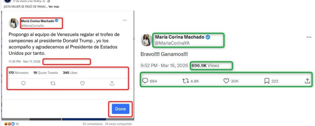Venezuela ganó por primera vez el Clásico Mundial de Béisbol luego de vencer a Estados Unidos el 17 de marzo de 2026. A raíz de esto, en redes sociales se difundió un supuesto mensaje en X de la dirigente opositora María Corina Machado en el que habría propuesto regalarle la copa al presidente estadounidense, Donald Trump, al igual que hizo ella con el galardón de su Nobel de Paz. Pero esto es falso. El mensaje, compartido más de 3.000 veces, es un montaje.
