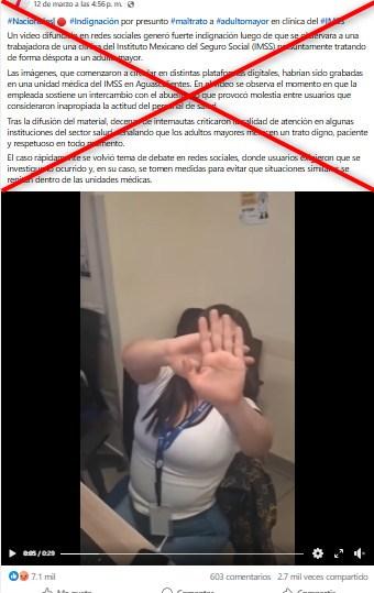 “Un video difundido en redes sociales generó fuerte indignación luego de que se observara a una trabajadora de una clínica del Instituto Mexicano del Seguro Social (IMSS) presuntamente tratando de forma déspota a un adulto mayor”, dice una publicación en Facebook, haciendo alusión a que la escena habría ocurrido en la sucursal de la ciudad de Aguascalientes.
