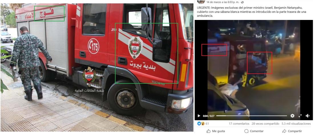 La ambulancia en el video de CBS y la que aparece en la grabación viral es la misma. El camión de bomberos también es igual a los que utilizan en Beirut. Una comparación entre los vehículos permite ver elementos idénticos.