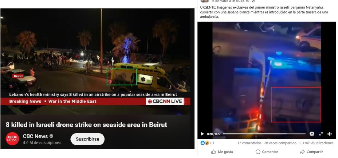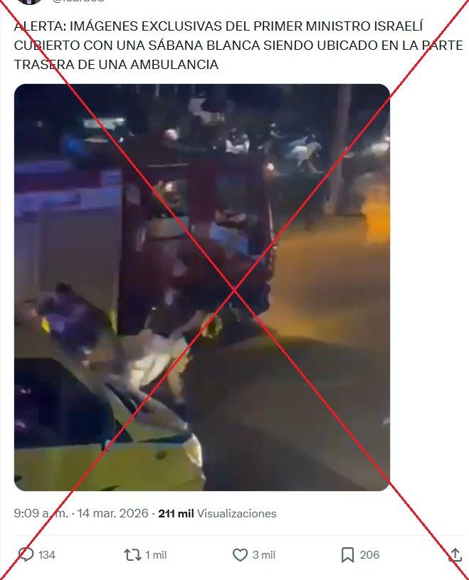 Los rumores de la muerte del primer ministro de Israel, Benjamín Netanyahu, se intensificaron luego de que usuarios cuestionaran la autenticidad de sus videos en medio de la guerra contra Irán, cuyos líderes prometieron asesinarlo. Desde el 14 de marzo de 2026, circula en redes sociales una grabación que supuestamente muestra a Netanyahu siendo trasladado a una ambulancia, cubierto con una sábana blanca. En realidad, el video, compartido más de 1.500 veces, fue grabado en Beirut, Líbano, cuando rescatistas acudieron al sitio de un ataque israelí contra un supuesto objetivo de Hezbolá.