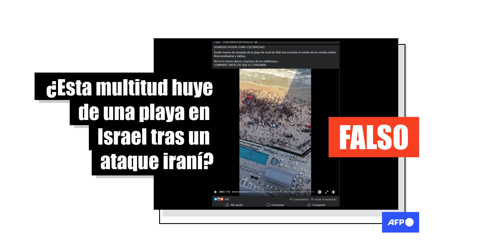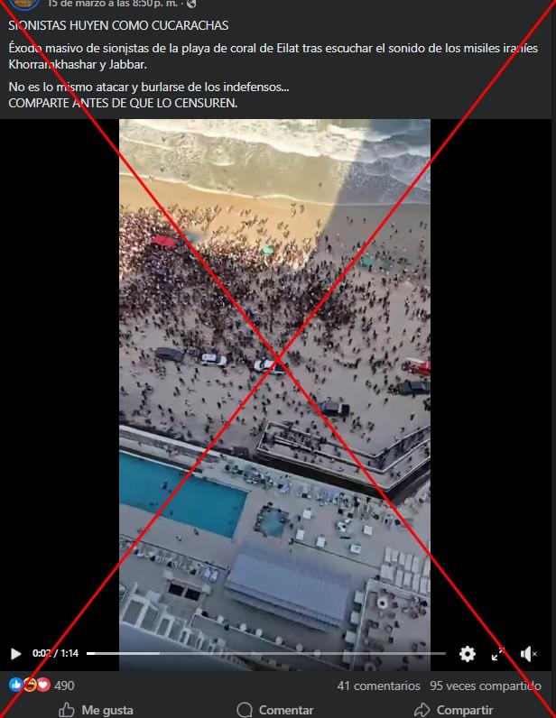 “SIONISTAS HUYEN COMO CUCARACHAS. Éxodo masivo de sionįstas de la playa de coral de Eilat tras escuchar el sonido de los misiles iraníes Khorramkhashar y Jabbar”, dicen las publicaciones en Facebook (1, 2) acompañadas de un video en el que se ve desde la altura a una multitud dispersándose en una playa.