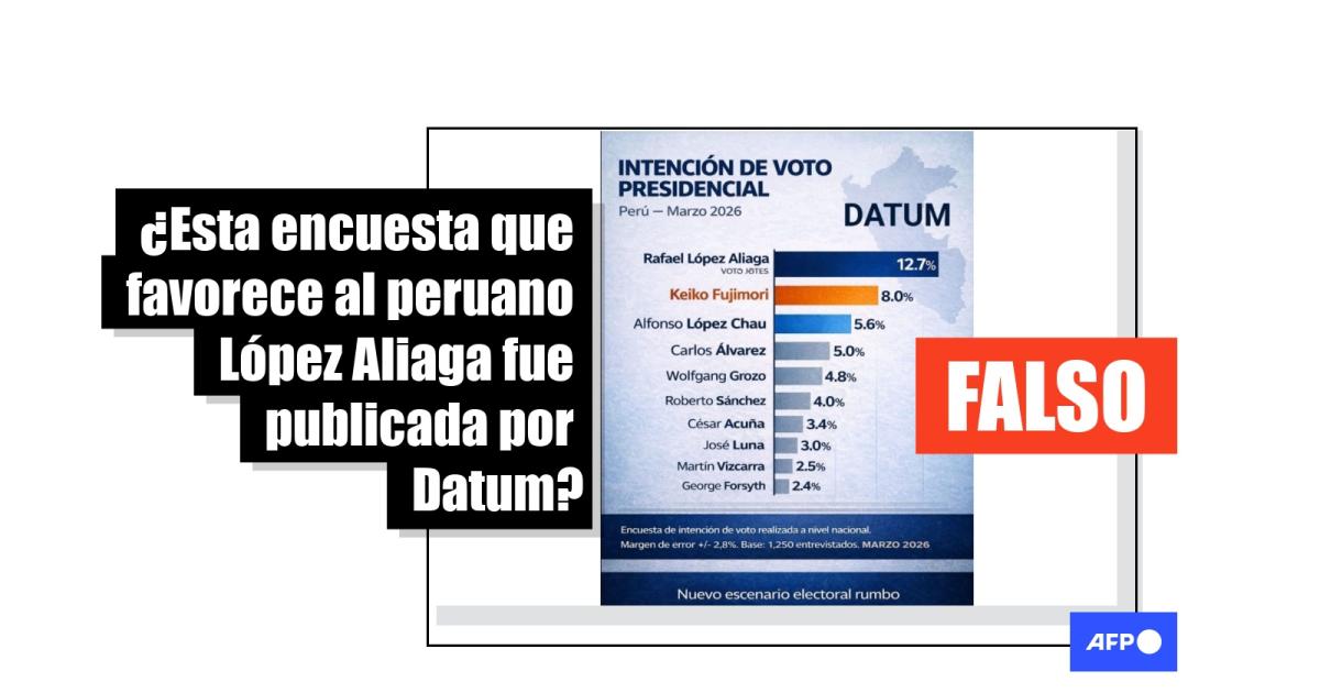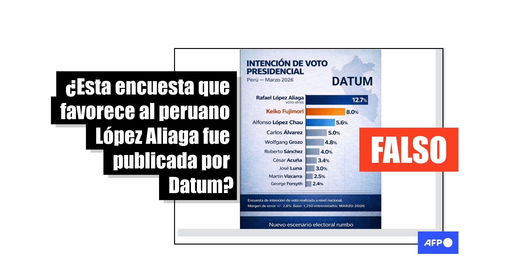 El candidato peruano Rafael López Aliaga, del partido Renovación Popular, es uno de los favoritos para las presidenciales del 12 de abril de 2026, según sondeos. Sin embargo, es falso que haya liderado con más de 12% la encuesta de Datum Internacional publicada el 8 de marzo, como asegura una placa compartida más de 500 veces en redes sociales desde ese entonces. Ese estudio de Datum, en realidad, lo ubicaba en segundo lugar con 10,0%, detrás de Keiko Fujimori, de Fuerza Popular, con 10,7%.