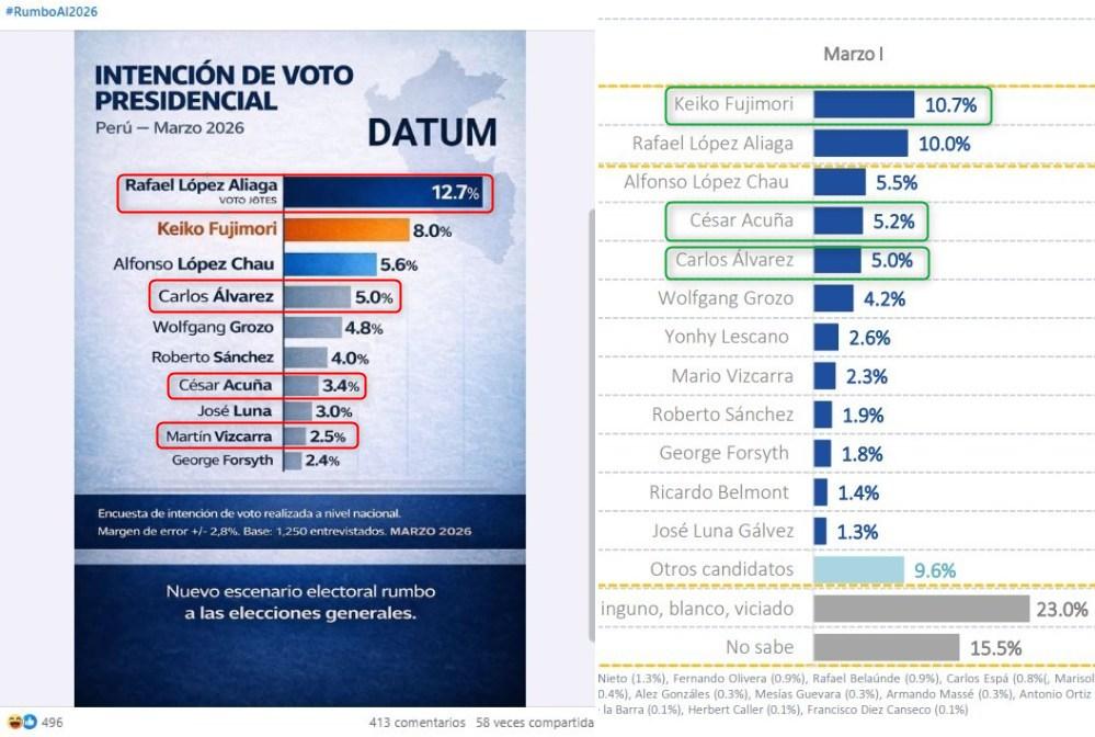 “Encuesta de voto presidencial. Perú-marzo 2026. Datum”, se lee en el encabezado de una gráfica (1, 2, 3) que circula en Facebook desde el 14 de marzo. En ella se coloca en primer puesto a López Aliaga con 12,7% y detrás a Fujimori con 8,0% y a López Chau con 5,6%.