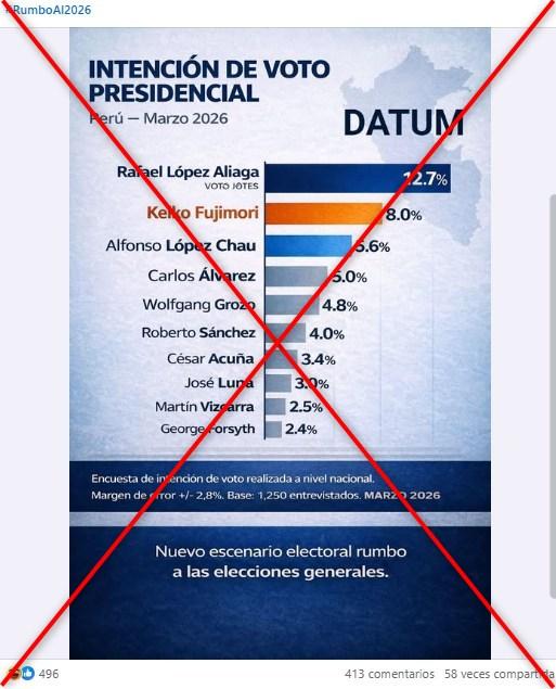 La placa comenzó a circular luego del primer estudio de Datum en marzo, publicado el 8 de ese mes. Tras una revisión, se comprobó que quien en realidad lideraba la intención de voto era Fujimori, quien aspira al Palacio de Gobierno por cuarta vez consecutiva. El porcentaje era menor que el viral: 10,7%. López Aliaga le seguía de cerca con 10,0%.