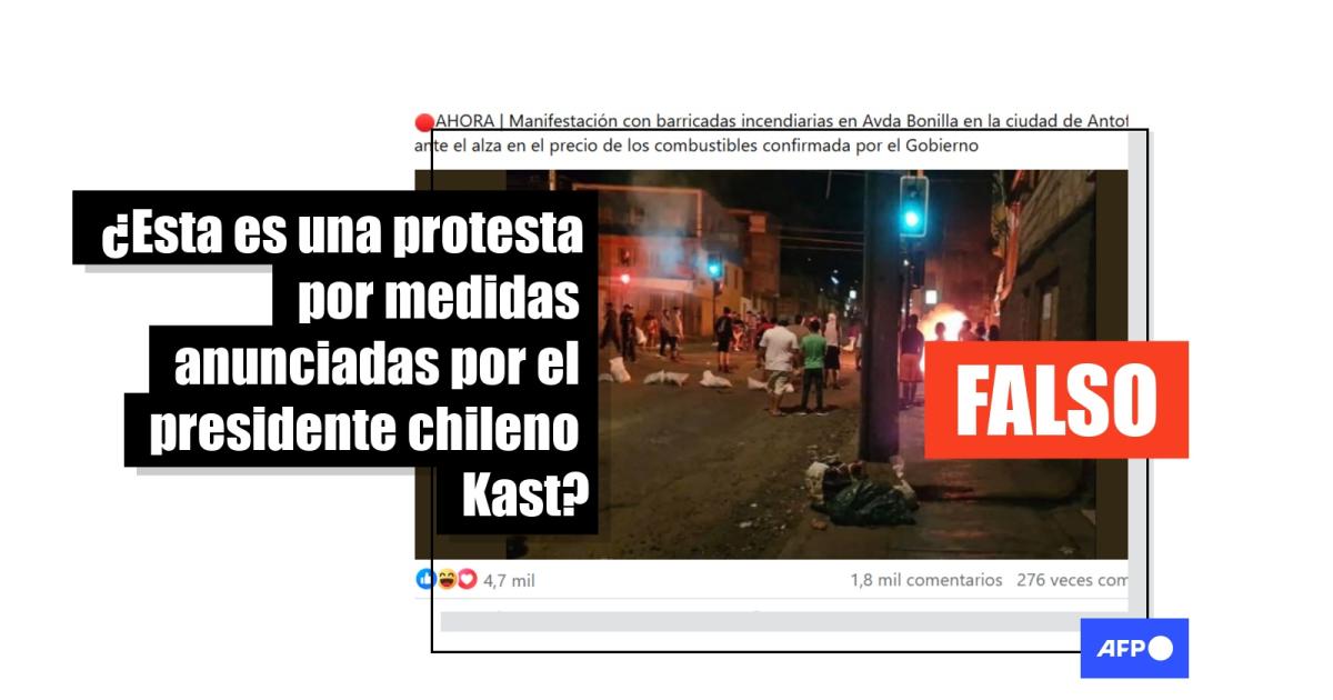 El nuevo gobierno chileno, encabezado por José Antonio Kast, anunció el 22 de marzo de 2026 un histórico aumento del precio de los combustibles, asociado a las repercusiones del petróleo tras la guerra de Medio Oriente. Dos días después, comenzó a circular en redes sociales una imagen de una calle en la ciudad de Antofagasta cortada con un incendio, supuestamente, a modo de protesta “ante el alza del precio de los combustibles”. Pero la captura, compartida más de 1.800 veces, es de una protesta relacionada con el estallido social en la ciudad en enero de 2020.