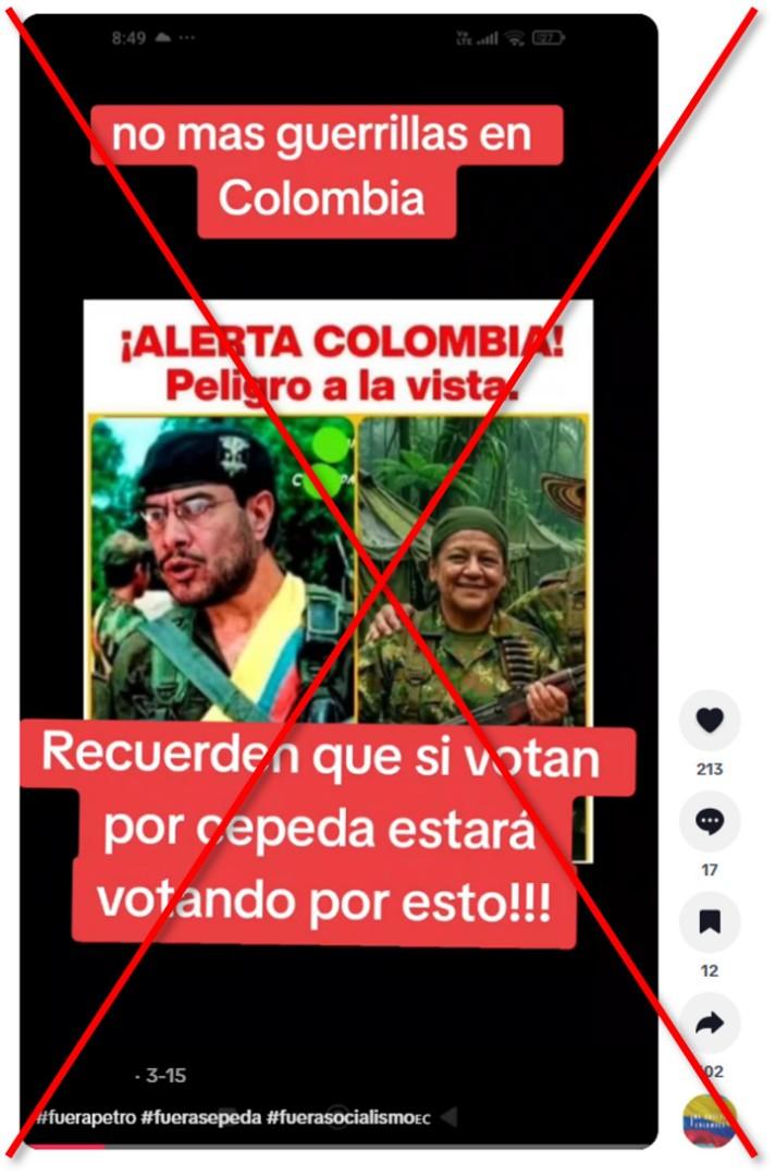 “No más guerrillas en Colombia. Recuerden que si votan por cepeda estará votando por esto!!!” o “Nuestra democracia está en peligro”, son algunos de los mensajes que acompañan la publicación difundida en TikTok y Facebook (1, 2).