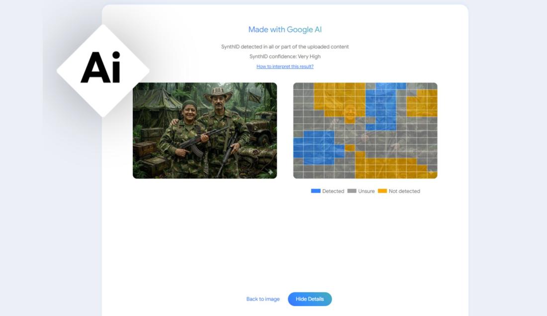 El detector SynthID confirmó que se utilizó la tecnología de Gemini para fabricar la imagen. El escáner de Hive Moderation coincidió en el resultado.