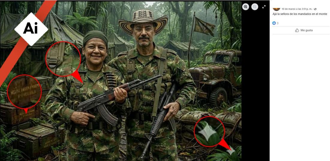 El candidato a la presidencia de Colombia, el oficialista Iván Cepeda, y su compañera de fórmula, la senadora y líder indígena Aída Quilcué, figuran como punteros para las elecciones del 31 de mayo de 2026, según encuestas de firmas como CNC y Guarumo-EcoAnalítica. En este escenario, ha sido compartida más de 300 veces en redes sociales desde el 15 de marzo una imagen en la que los dos aparecen vestidos de guerrilleros junto a una frase en la que se advierte que la “democracia está en peligro”. Sin embargo, el contenido es un montaje y una parte fue hecha con inteligencia artificial.