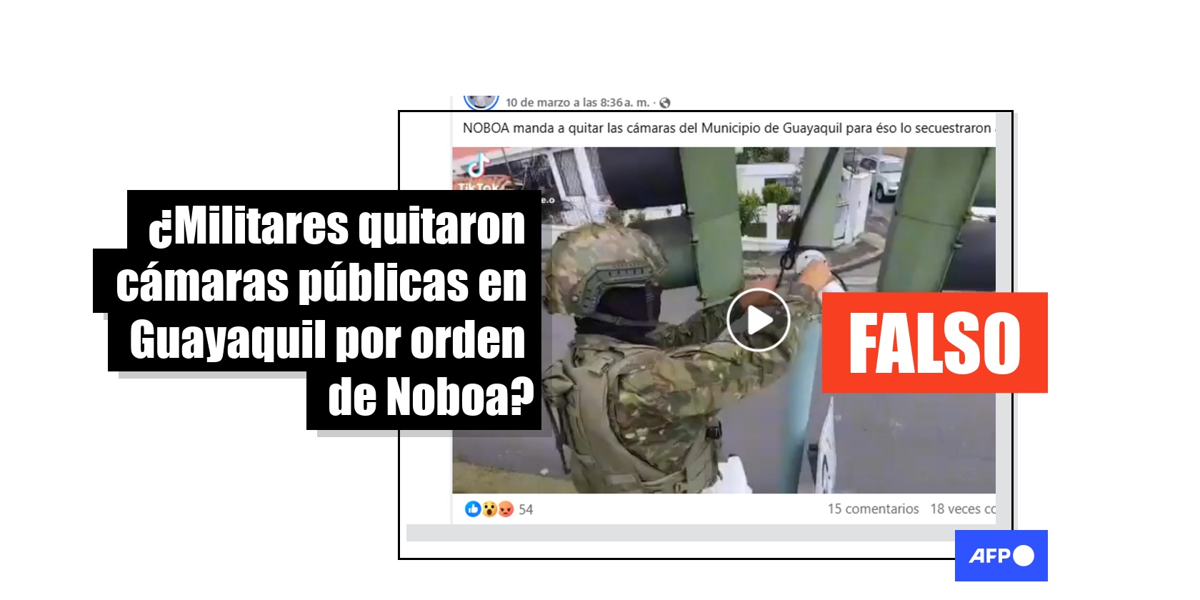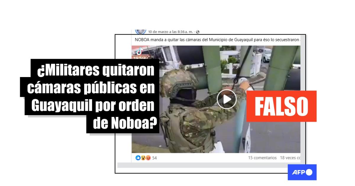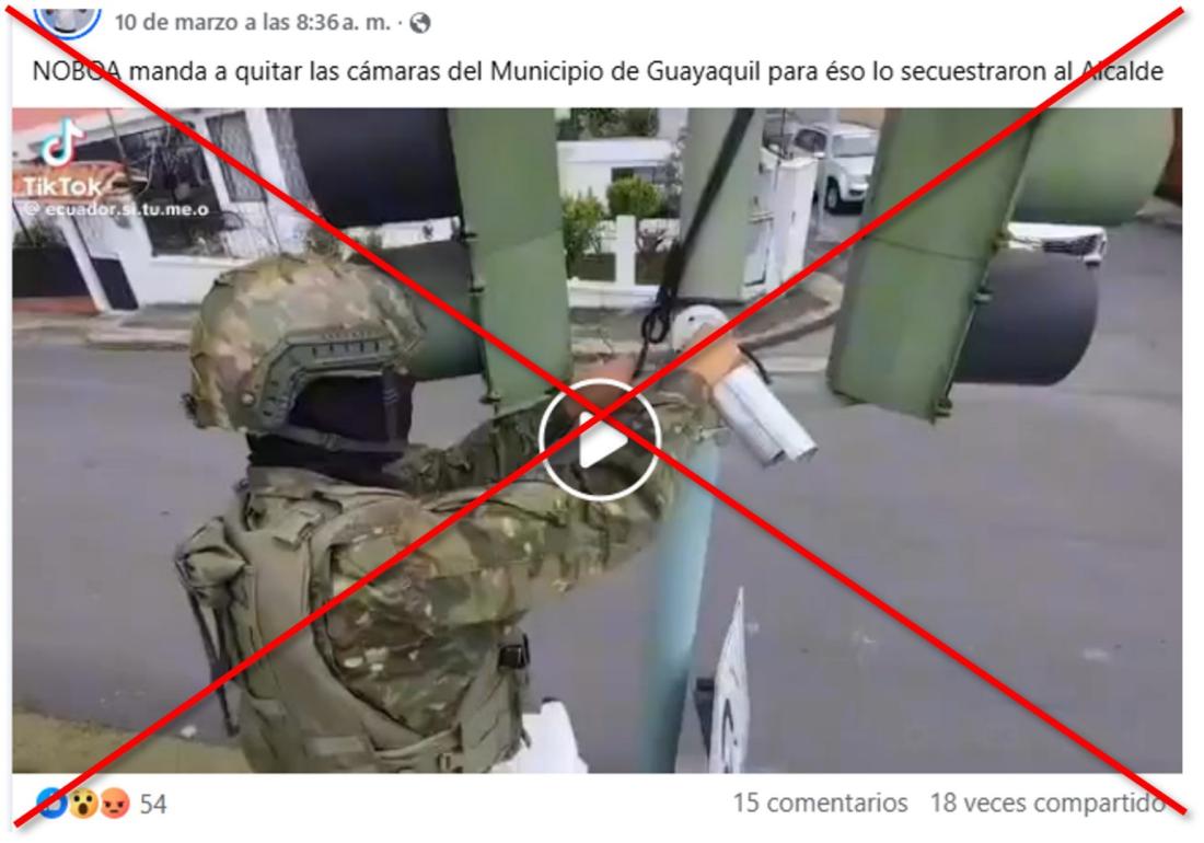 El 10 de febrero de 2026, el entonces alcalde de la ciudad ecuatoriana de Guayaquil, el opositor Aquiles Álvarez, fue detenido por presunto lavado de activos. Tras un mes de su captura, usuarios en redes sociales afirman, basados en un video de un operativo militar, que el presidente Daniel Noboa ordenó retirar las cámaras de seguridad del municipio. Pero el metraje, compartido más de 5.000 veces, corresponde al desmantelamiento de un sistema de espionaje instalado por grupos criminales en otra localidad.