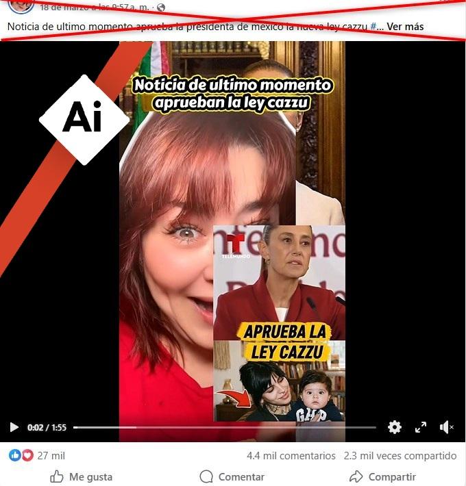 “Voy a aprobar la ley Cazzu para que entre en circulación a partir de hoy. Los hijos deben estar con la madre, no con los padres irresponsables”, se le escucha decir a Sheinbaum en un video que circula en Facebook, Instagram y TikTok.
