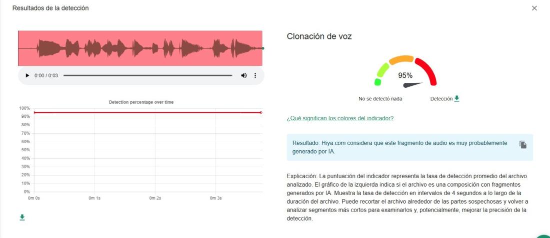 Un análisis del fragmento de audio en el que habla Sheinbaum con la herramienta Hiya, de InVID WeVerify, arrojó 95% de probabilidades de haber sido creado con IA.