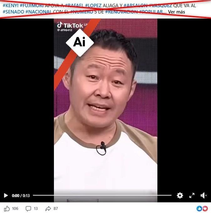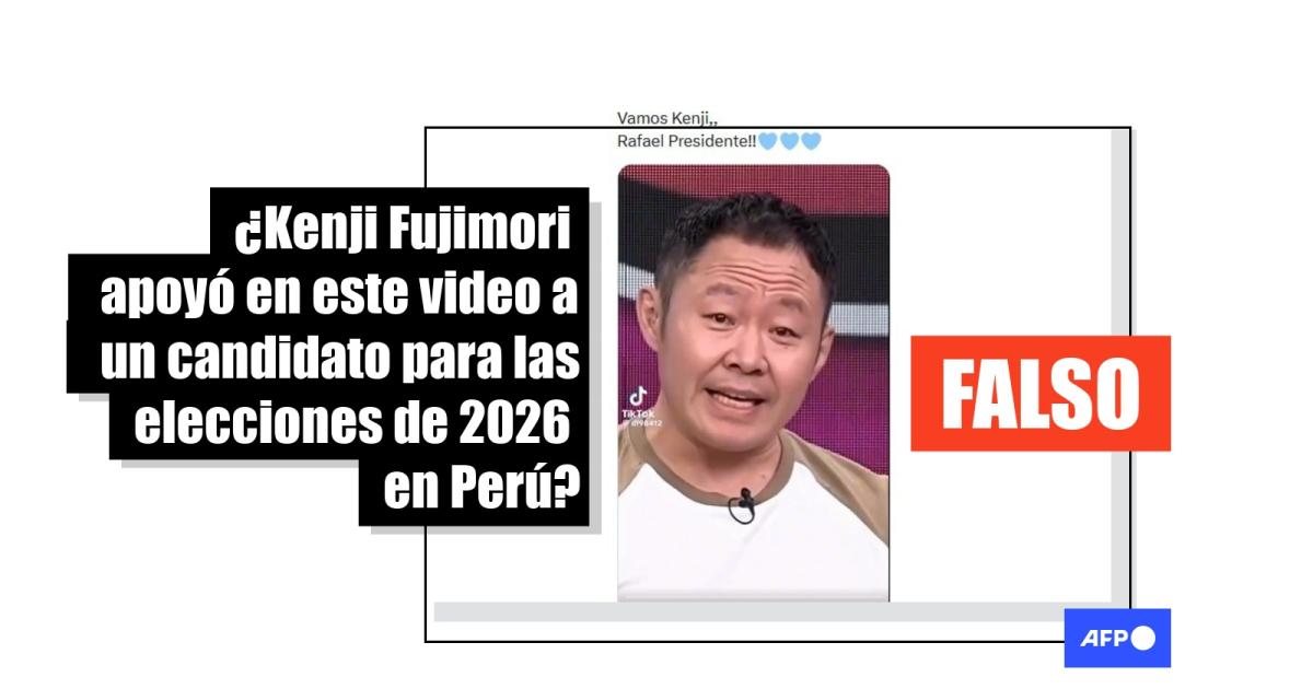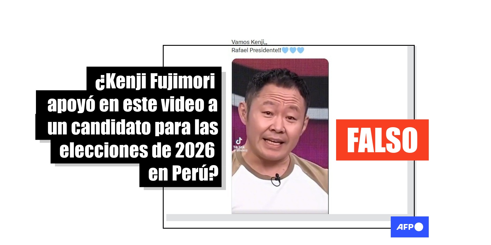 El excongresista peruano Kenji Fujimori, hijo del expresidente Alberto Fujimori, expresó en varias ocasiones que no tiene interés en involucrarse en política, pese a que su hermana, Keiko, busca por cuarta vez llegar a la Presidencia en las elecciones del 12 de abril de 2026, con el partido Fuerza Popular. Sin embargo, a días de la votación, más de 1.000 usuarios en redes sociales comparten un video del exparlamentario declarando su respaldo a la candidatura al Senado de Absalón Vásquez por Renovación Popular. Pero se trata de una secuencia alterada con IA.