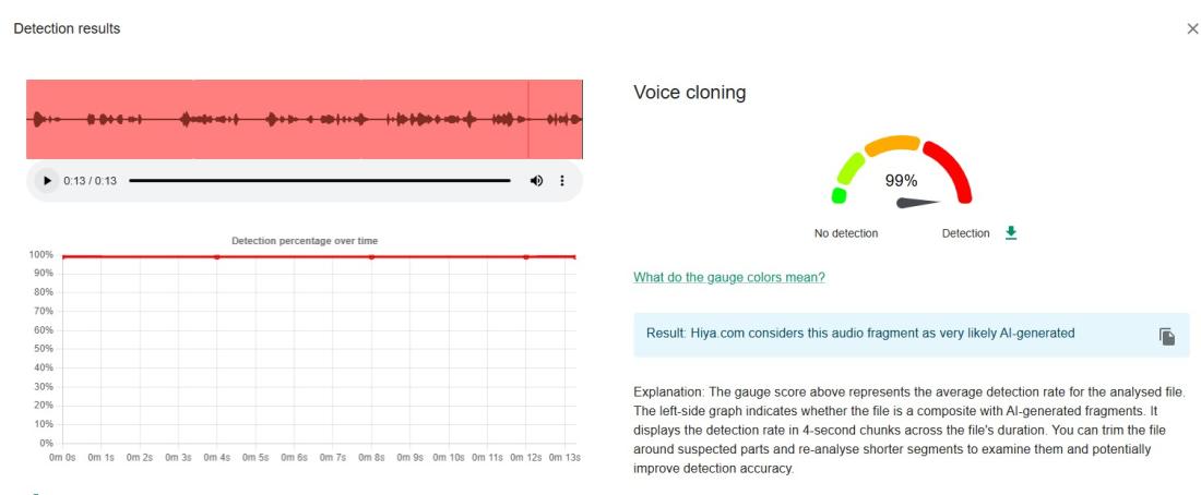 Un análisis del audio del metraje con Hiya, la herramienta de InVID-WeVerify, mostró un 99% de probabilidad de que fue producido con IA.