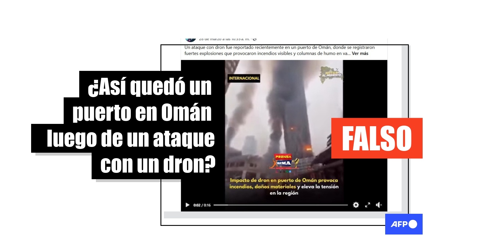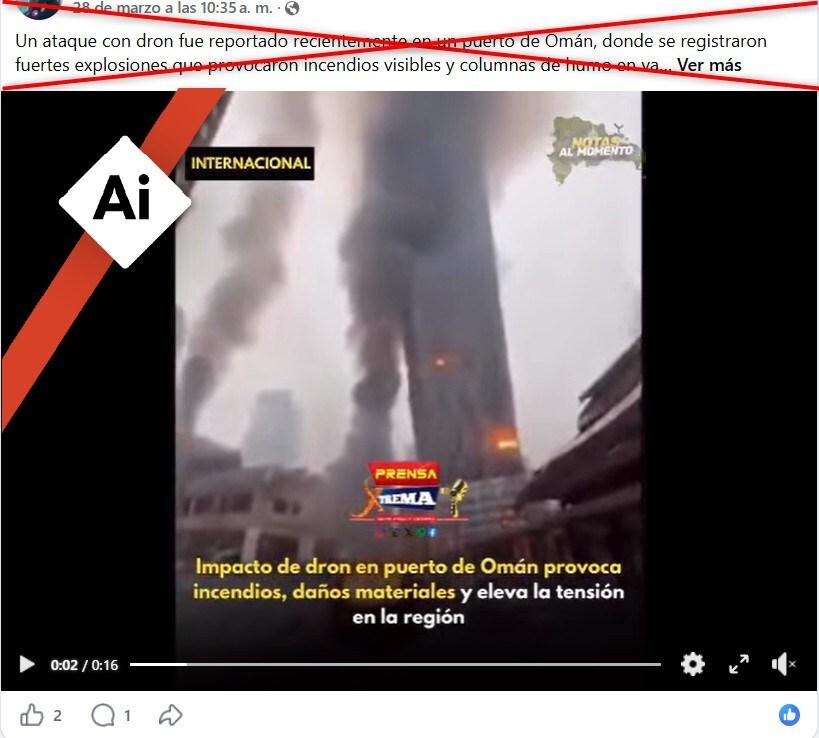 El puerto de Salalah en Omán fue evacuado el 28 de marzo de 2026 luego de ser alcanzado por un dron durante la guerra en Oriente Medio. En ese contexto, un video compartido en redes sociales muestra una calle destruída y edificios en llamas como si se tratase de las consecuencias del ataque en Salalah. Sin embargo, la secuencia fue generada con inteligencia artificial (IA).