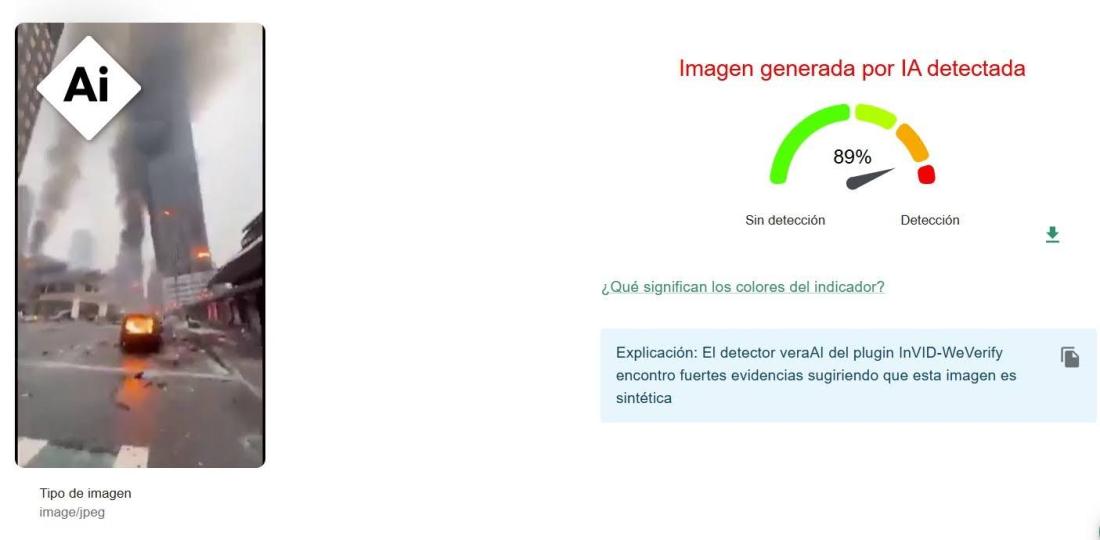Un análisis de un fotograma del video con la herramienta de verificación InVID-WeVerify, desarrollada en colaboración con la AFP, arrojó un 89% de probabilidad de que la grabación fue creada con IA.