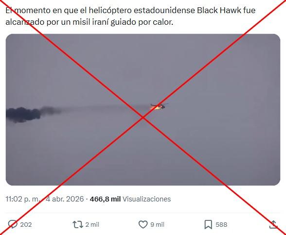 A inicios de abril de 2026, Irán anunció que derribó dos helicópteros Black Hawk estadounidenses que cumplían labores de rescate. En este contexto, desde el 4 de ese mes, ha sido compartido más de 3.000 veces en redes sociales un video que mostraría el momento en que el ejército iraní abatió a una de estas aeronaves. Sin embargo, la secuencia corresponde al derribo de un helicóptero en Siria en 2020.