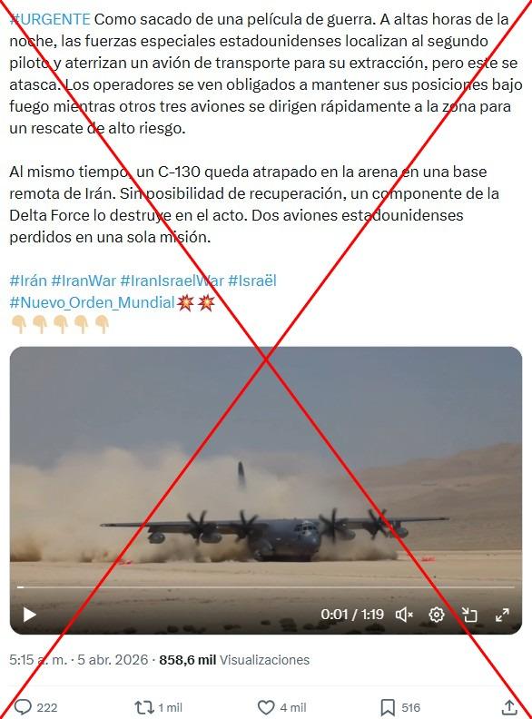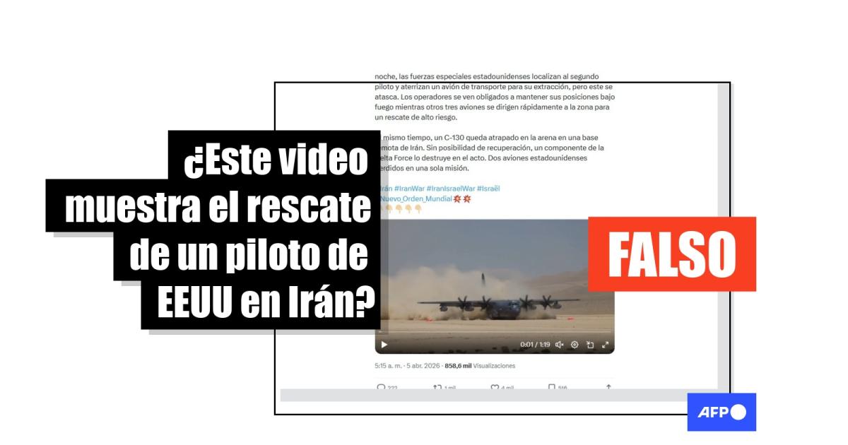 Estados Unidos llevó a cabo un rescate a un piloto herido cuyo avión cayó en Irán el 3 de abril de 2026, durante la guerra en Medio Oriente. Desde entonces, más de 1.700 usuarios de redes sociales han compartido un video asegurando que muestra ese operativo. Pero las imágenes en realidad provienen de un ejercicio de entrenamiento militar realizado en julio de 2024, en el estado de California.