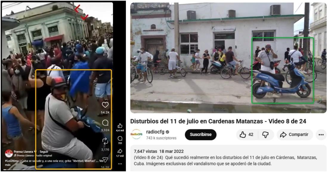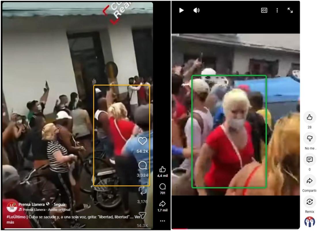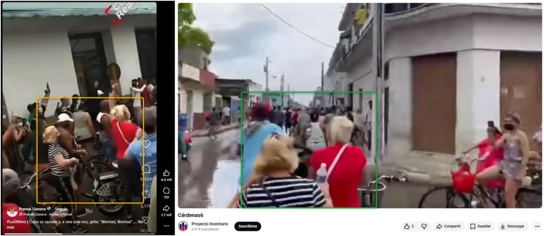 Por ejemplo, un video de YouTube publicado el 1 de mayo de 2023 con la descripción “Protestas en Cárdenas, Matanzas, el 11 de julio de 2021 en Cuba” muestra a una mujer rubia con blusa roja que lleva un bolso con una cinta blanca. La misma persona aparece en el fragmento que se viralizó recientemente en redes sociales.