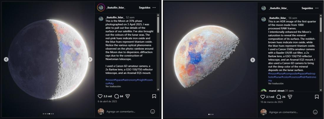 En ambas descripciones, Ibatullin mencionó el equipo fotográfico que usó para hacer las imágenes, como cámaras digitales, telescopios, y la tecnología HDR (High Dynamic Range o Alto Rango Dinámico) que permite aumentar el contraste, el tono y el brillo.