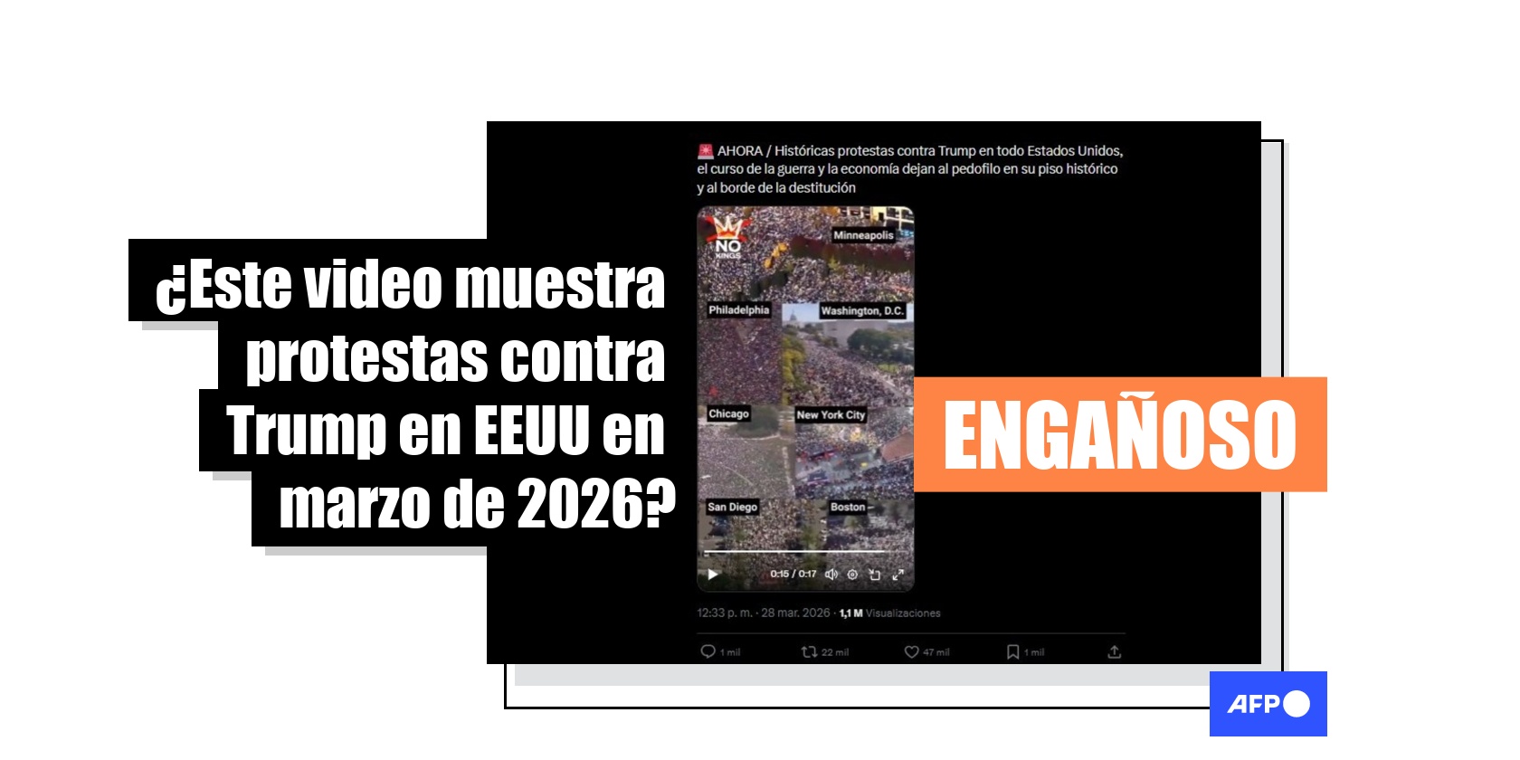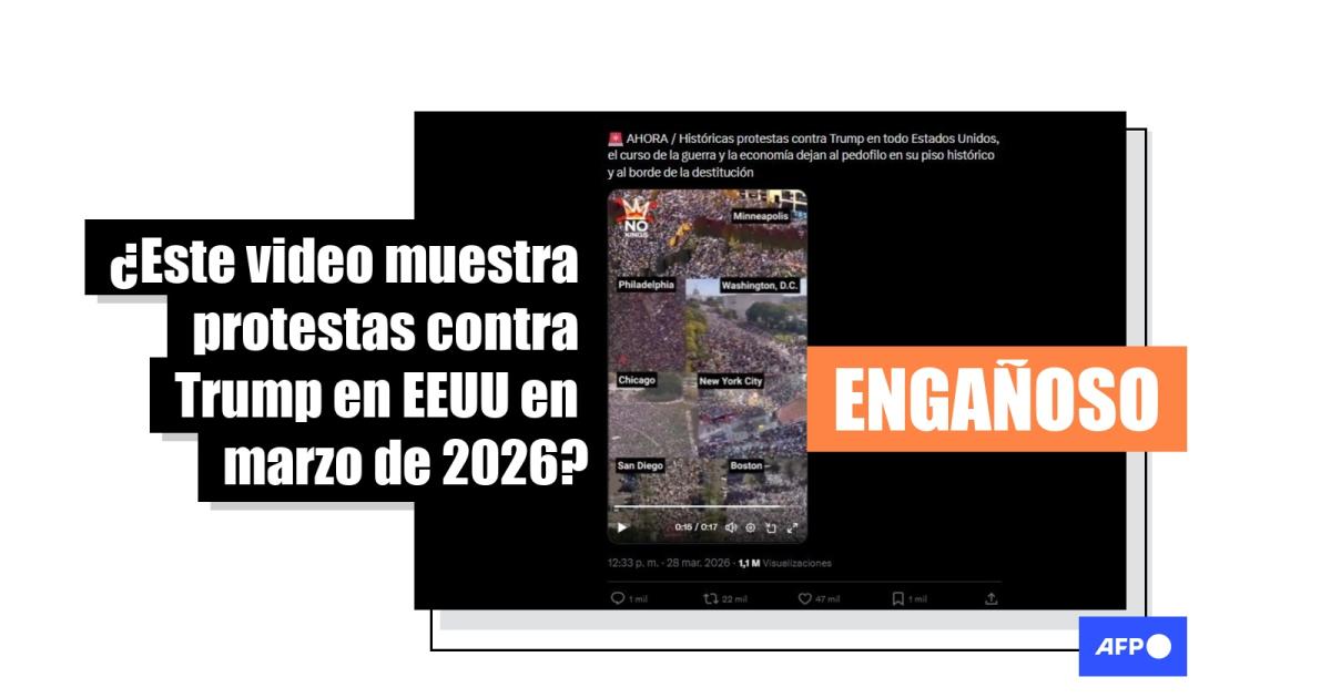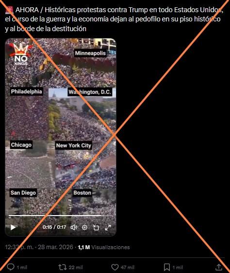 El 28 de marzo de 2026, el movimiento “No Kings” realizó su tercera jornada de protestas en distintas ciudades de Estados Unidos en rechazo a las políticas del presidente Donald Trump. Desde entonces, un video con tomas aéreas de manifestaciones ha sido compartido más de 4.500 veces en redes sociales junto con la afirmación de que muestra la masiva movilización. Aunque la secuencia corresponde a marchas anti-Trump convocadas por ese movimiento, en realidad fue grabada en octubre de 2025, cuando se llevó a cabo la segunda edición.