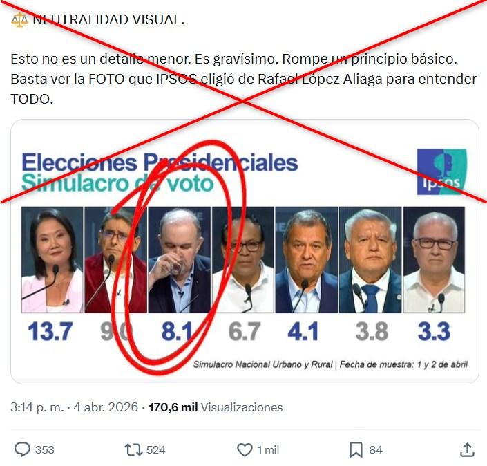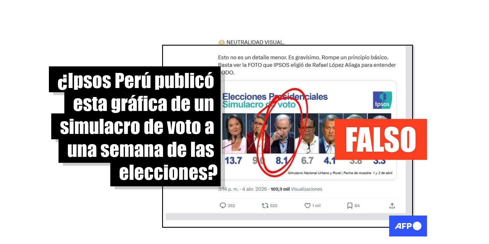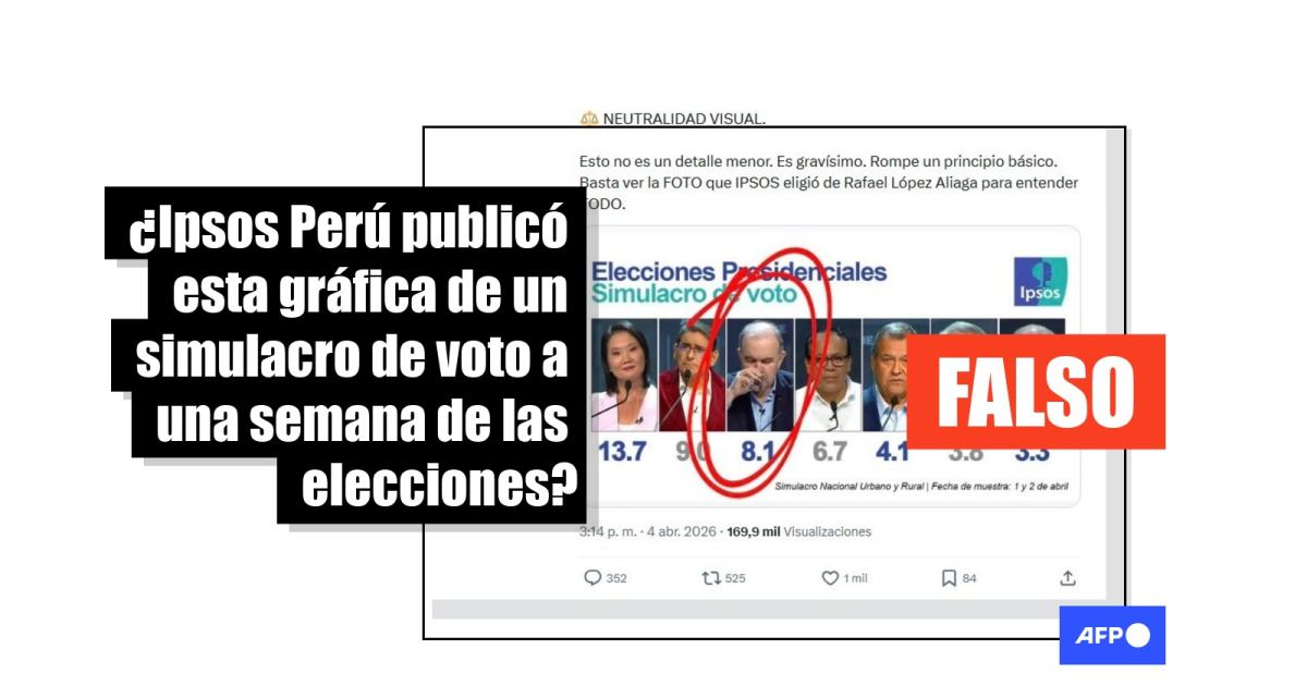 Los peruanos elegirán a su presidente en una primera vuelta el 12 de abril de 2026. A pocos días de la votación, comenzó a circular en redes sociales una supuesta gráfica de la encuestadora Ipsos con resultados de un simulacro de votación que muestra a varios candidatos de frente, pero a Rafael López Aliaga, de Renovación Popular, bebiendo de un vaso. Los usuarios acusan que es una falta de “neutralidad visual”. Sin embargo, la imagen, que ha sido compartida más de 1.000 veces, es falsa. El simulacro real no incluye fotos.