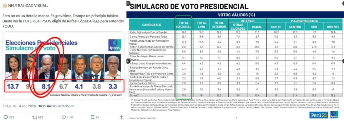 El último simulacro de voto, publicado el 4 de abril, fecha en la que comenzó a circular la placa viral, expuso que Fujimori alcanzó el 18,6% de los votos válidos, seguido por Álvarez con 12,1% y López Aliaga con 10,9%. Sin embargo, en la gráfica viral se muestran porcentajes distintos que, en realidad, corresponden a los votos emitidos en ese simulacro, y no a los votos válidos.
