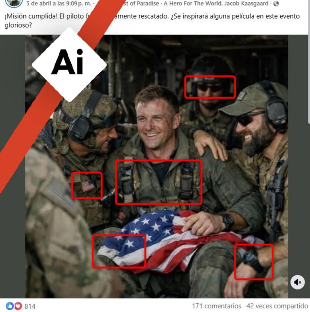 El presidente de Estados Unidos, Donald Trump, informó el 5 de abril de 2026 que fuerzas especiales rescataron al segundo tripulante de un avión de combate derribado en la guera con Irán. Tras el anuncio, en redes sociales fue difundida una presunta imagen del aviador rodeado de tropas estadounidenses. Pero la foto, compartida más de 2.000 veces, es falsa. El contenido probablemente fue creado con inteligencia artificial (IA). El gobierno no ha publicado ninguna foto oficial de la misión.