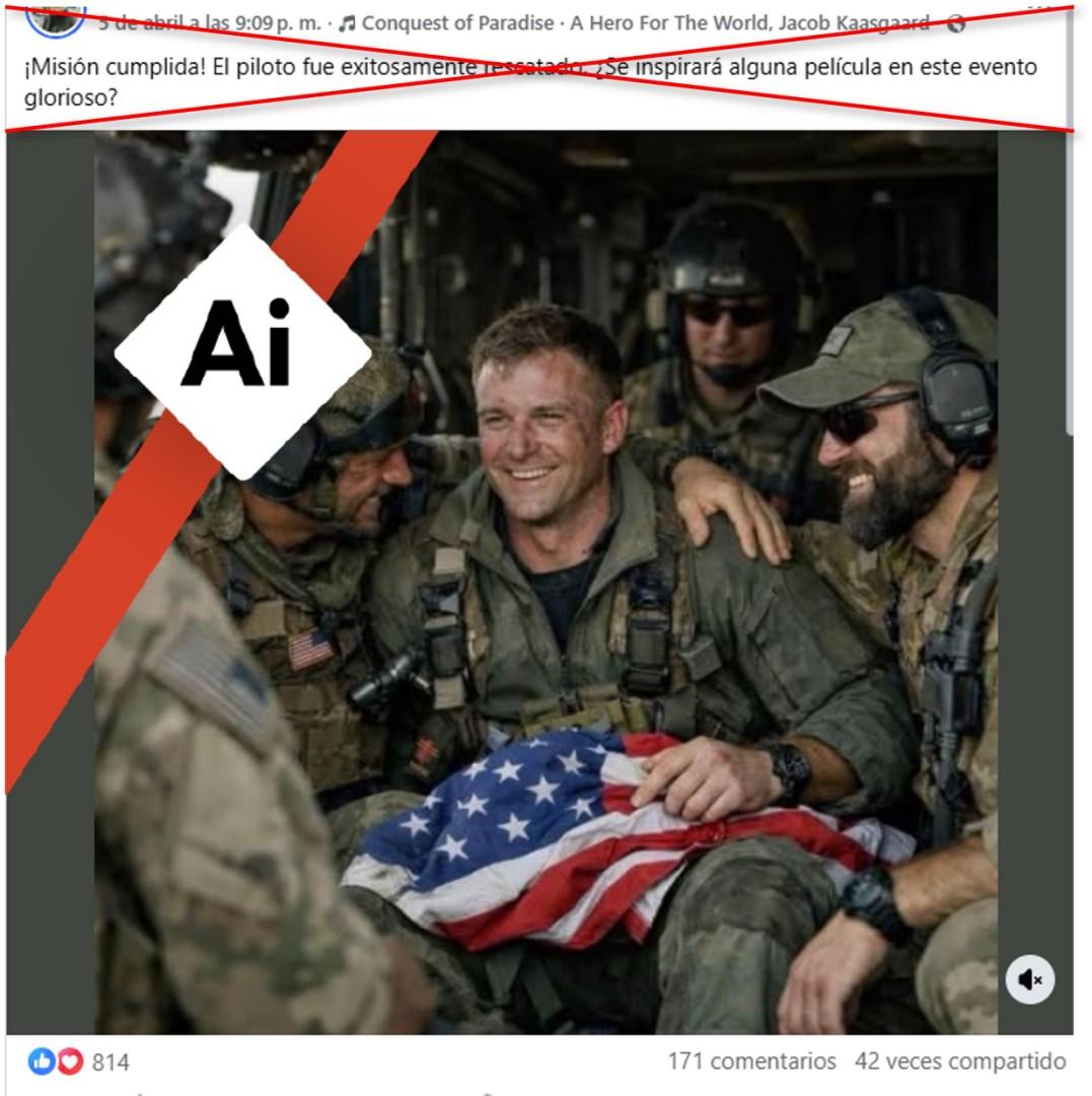 “El es el coronel Karr, el piloto estadounidense que (…) fue rescatado por las fuerzas especiales militares estadounidenses” o “¡Misión cumplida! El piloto fue exitosamente rescatado”, son algunos de los mensajes difundidos en X (1, 2), Facebook (1, 2) e Instagram (1, 2).