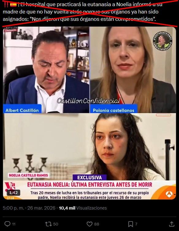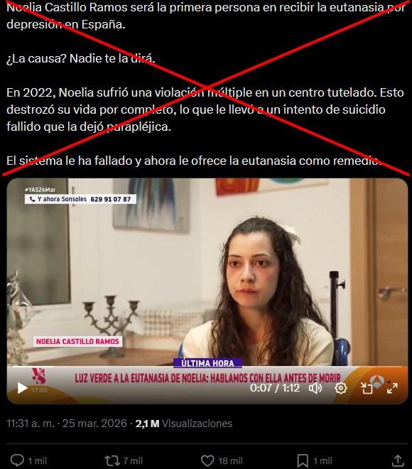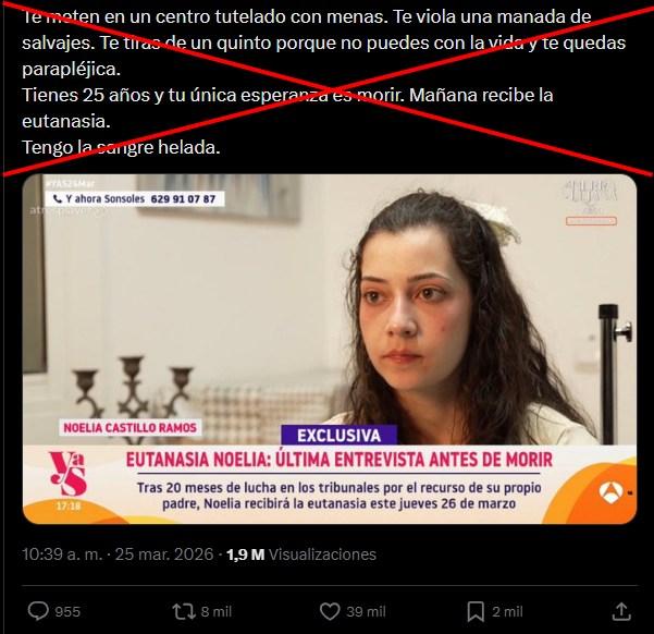 En marzo de 2026, la eutanasia de la joven española Noelia Castillo, con paraplejia tras un intento de suicidio, suscitó polémica en medios de comunicación y redes sociales, y también atrajo desinformación. Usuarios difundieron afirmaciones infundadas, como que la joven fue agredida sexualmente por menores extranjeros en un centro tutelado o que fue presionada porque sus órganos iban a donarse, además de imágenes descontextualizadas. Los contenidos fueron alimentados por grupos contra la eutanasia, según expertos consultados.