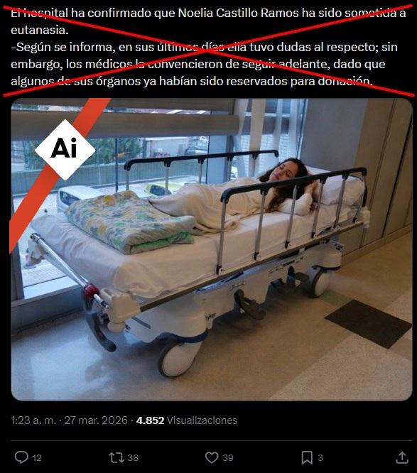 No solo circuló desinformación antes del fallecimiento de Noelia, sino también después, cuando publicaciones en Facebook, Instagram y X, así como en francés, alemán, inglés y árabe, compartieron una foto en la que supuestamente aparece Noelia en la cama del hospital.