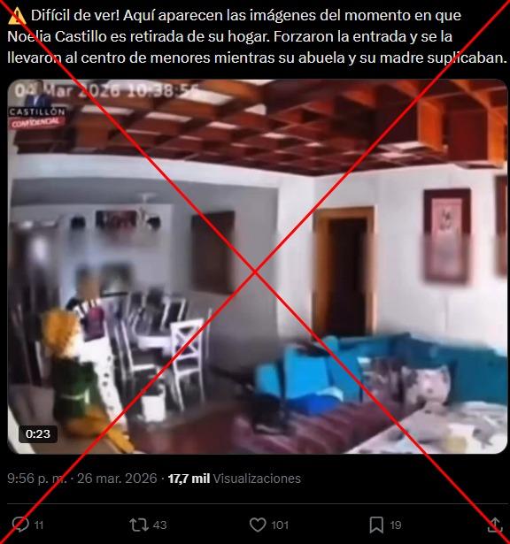 También se ha difundido una grabación de una cámara de seguridad de una intervención policial en una vivienda. Usuarios en X, Facebook, TikTok, Instagram y Threads aseguraron que se trataba del momento “en que Noelia Castillo es retirada de su hogar”, cuando era menor. También se viralizó en inglés, francés, polaco y turco.