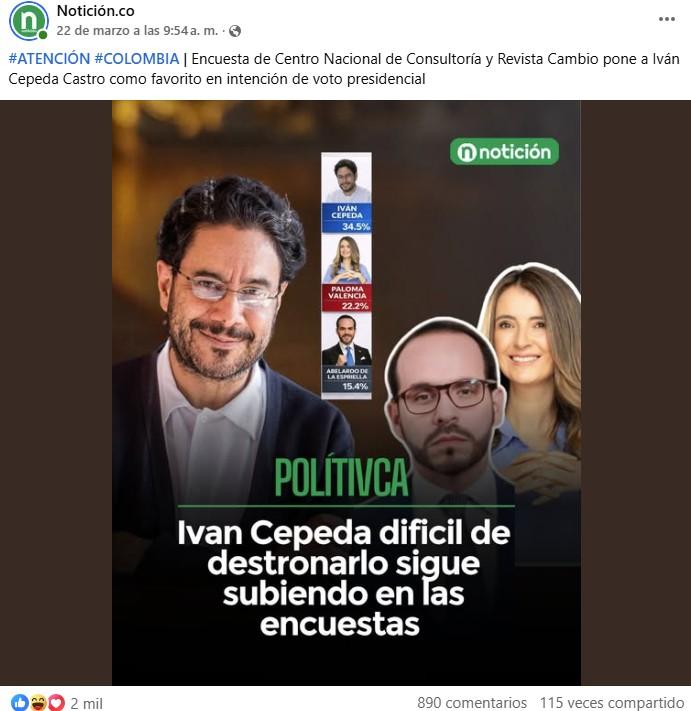 “Encuesta de Centro Nacional de Consultoría y Revista Cambio pone a Iván Cepeda Castro como favorito en intención de voto presidencial”, indica el texto que acompaña una imagen con el logo del portal informativo Notición.