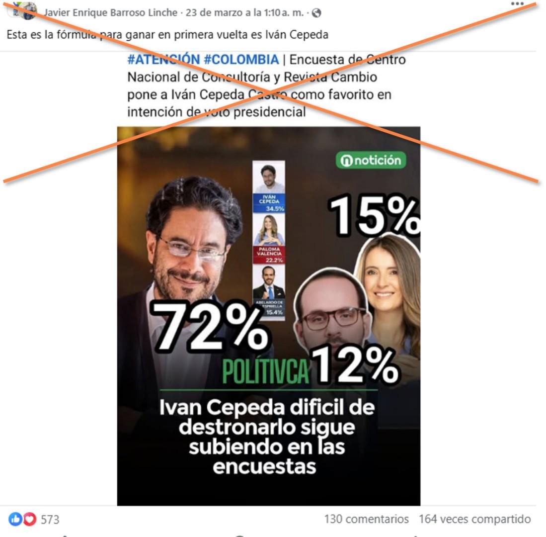 Una encuesta del Centro Nacional de Consultoría en Colombia, del 22 de marzo de 2026, ubicó al senador oficialista Iván Cepeda a la cabeza de la intención de voto para las elecciones del 31 de mayo. Sin embargo, es falso que el sondeo mostrara al aspirante con un 72% de preferencia, como indica una imagen difundida más de 400 veces en redes sociales. Con ese resultado evitaría un balotaje. En realidad, el estudio le dio un 34,5% de favorabilidad.