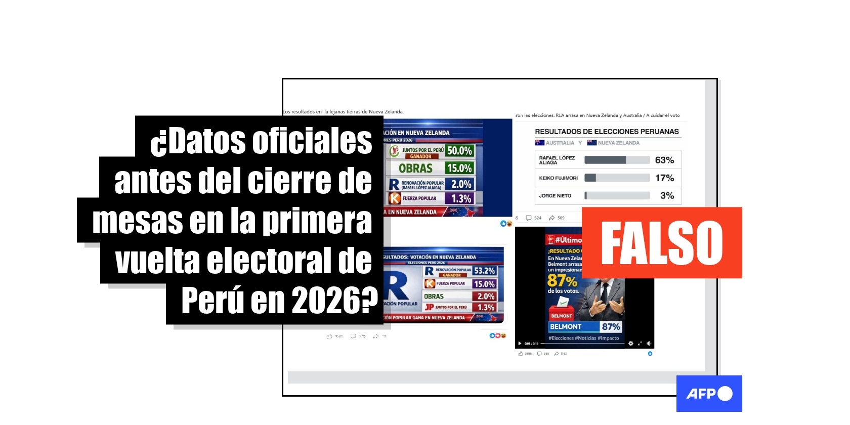 Más de 27 millones de personas están llamadas a participar en los comicios del 12 de abril de 2026 de Perú. Durante la jornada, 1.000 usuarios en redes sociales comparten publicaciones que afirman que, incluso antes del cierre de las mesas de votación, ya se conocen los primeros “resultados oficiales” de los comicios en el exterior. Sin embargo, la Oficina Nacional Procesos Electorales (ONPE) confirmó a la AFP que los datos virales no son oficiales y que prevén que las actas extranjeras lleguen al país el 13 de abril. Los primeros resultados se conocerán cuando culmine la jornada electoral.