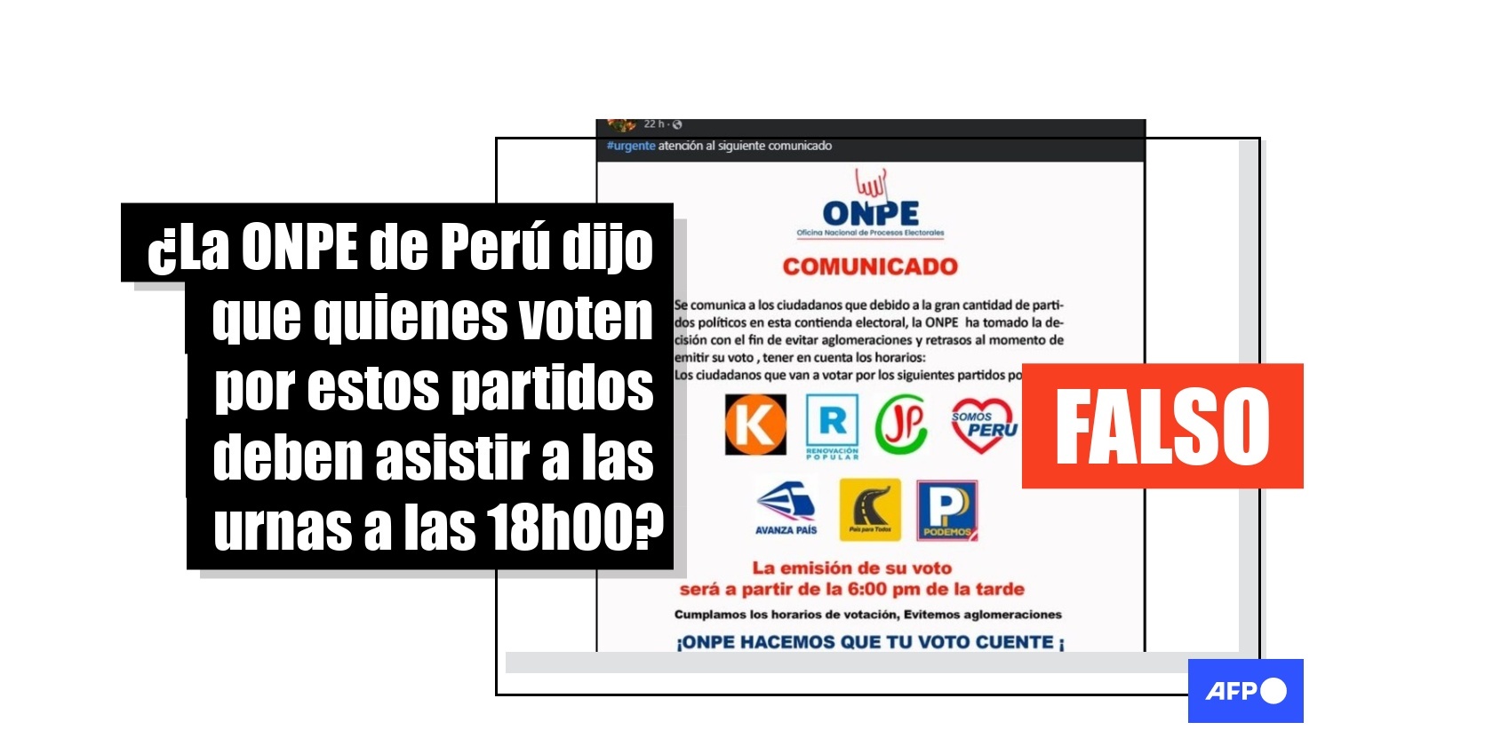 Perú inició el 12 de abril de 2026 las votaciones para elegir presidente y parlamentarios en una elección inédita con 35 candidatos presidenciales. Durante la jornada, en redes sociales circuló un supuesto aviso de la Oficina Nacional de Procesos Electorales (ONPE) que afirma que quienes voten por algunos partidos, como Perú Libre, Renovación Popular o Juntos por el Perú, deben hacerlo desde las 18h00. Pero la placa, compartida 500 veces, es falsa. El horario de votación es de 7h00 a 17h00, aunque se extendió una hora más por problemas logísticos, pudiendo elegir cualquier opción de la oferta electoral.