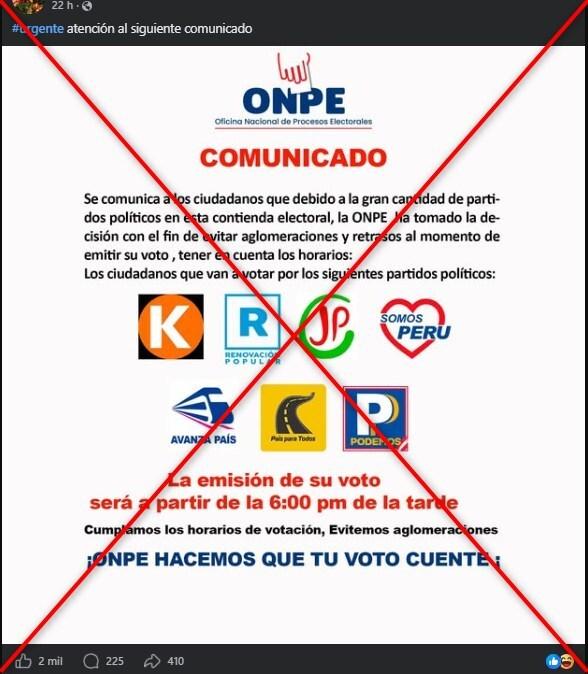 “Se comunica a los ciudadanos que debido a la gran cantidad de partidos políticos en esta contienda electoral, la ONPE ha tomado la decisión con el fin de evitar aglomeraciones y retrasos al momento de emitir su voto, tener en cuenta los horarios:”, comienza diciendo el supuesto comunicado que se difunde en Facebook (1, 2).