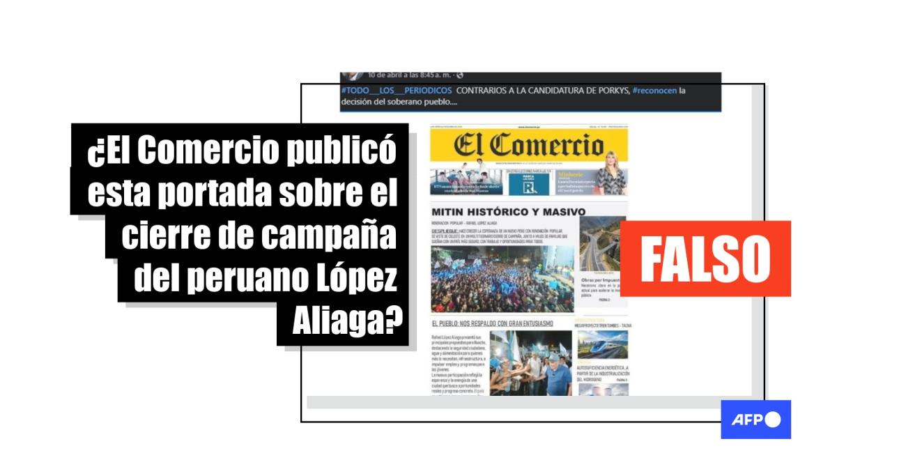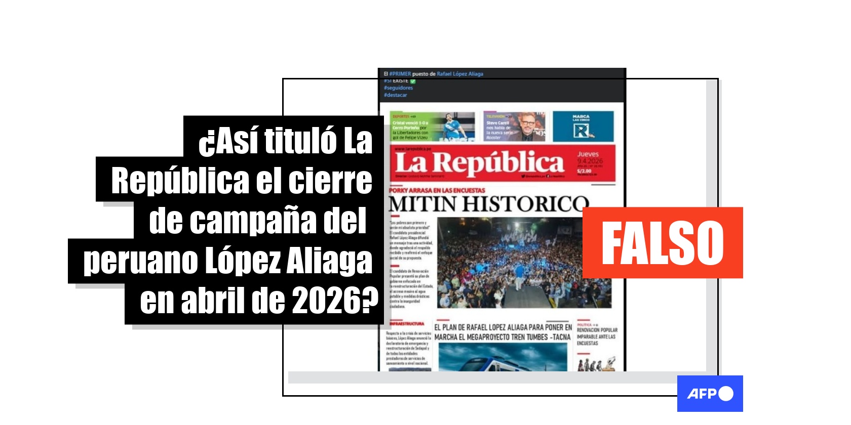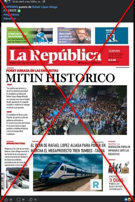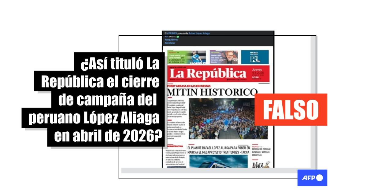 El candidato Rafael López Aliaga, del partido Renovación Popular, cerró su campaña en un acto en Lima, el 9 de abril de 2026. Desde entonces, circula en redes sociales una portada atribuida al diario peruano La República, en las que califica el mitin como “histórico”. Pero el contenido, que fue compartido más de 400 veces, es apócrifo.