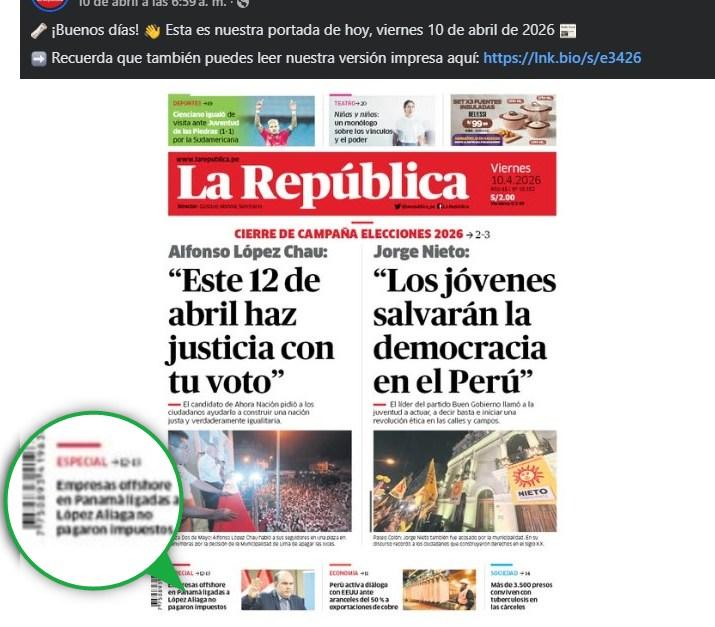 Una revisión de las redes de La República permitió comprobar que el 10 de abril su portada estuvo dedicada principalmente a los cierres de campaña de Alfonso López Chau, de Ahora Nación, y Jorge Nieto, del Partido del Buen Gobierno.