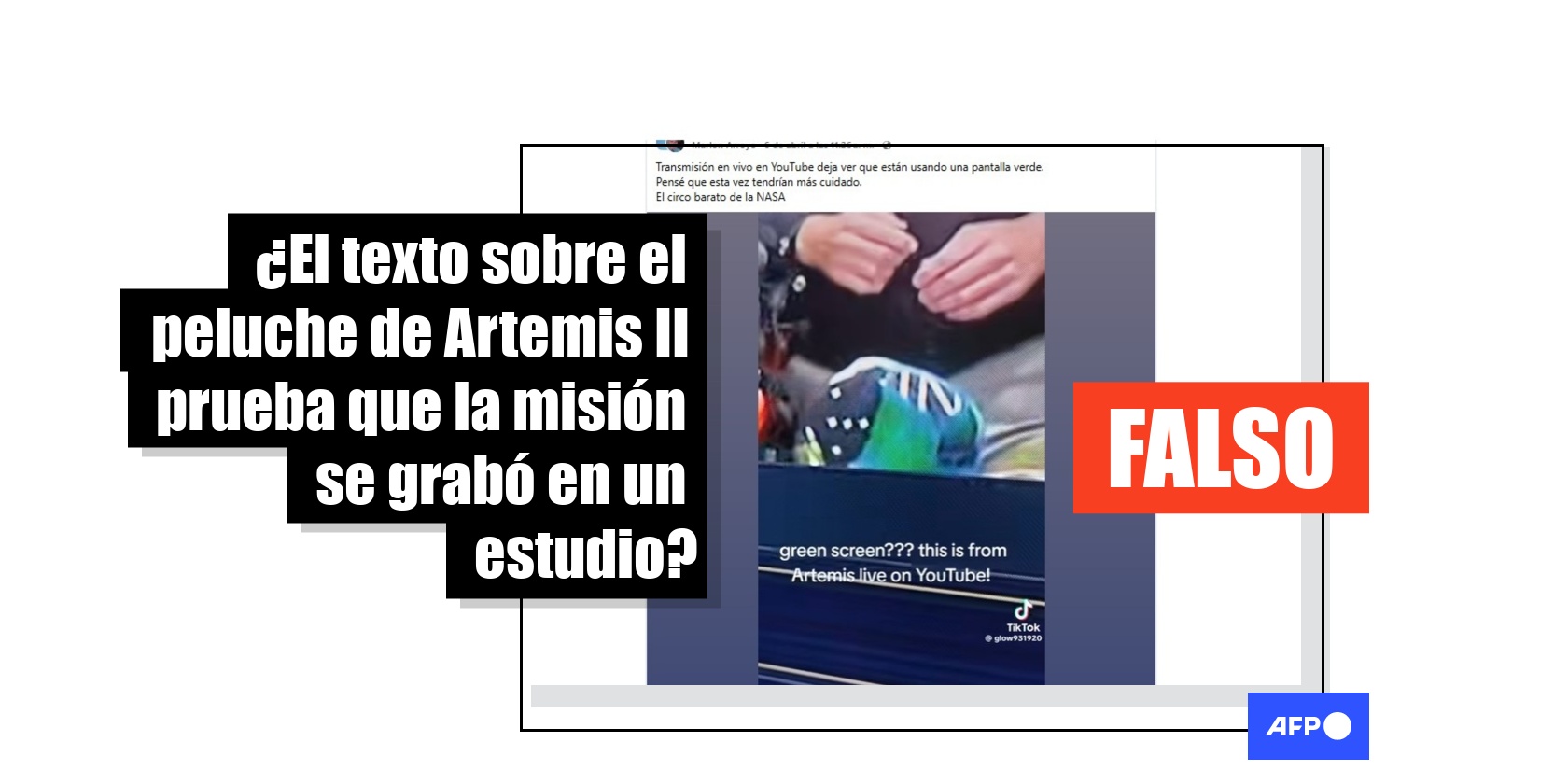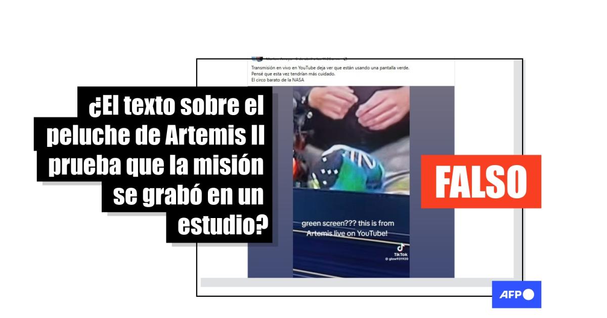 La misión Artemis II de la NASA finalizó el 10 de abril de 2026 después de que sus astronautas se convirtieran en los primeros humanos en viajar más lejos de la Tierra. Durante el viaje para orbitar la Luna, más de 1.300 usuarios de redes sociales compartieron un video de una transmisión de la misión en vivo en la cual se ve que sobre “Rise”, la mascota de la misión, se proyecta un texto que, según usuarios, probaría que Artemis se grabó en un estudio croma. Sin embargo, en ninguna de las emisiones en directo aparecieron esas letras sobre el peluche.