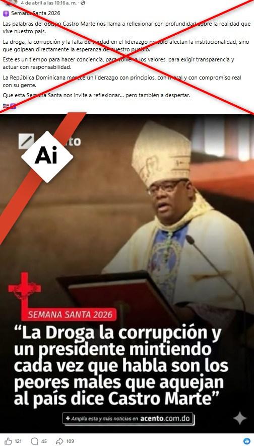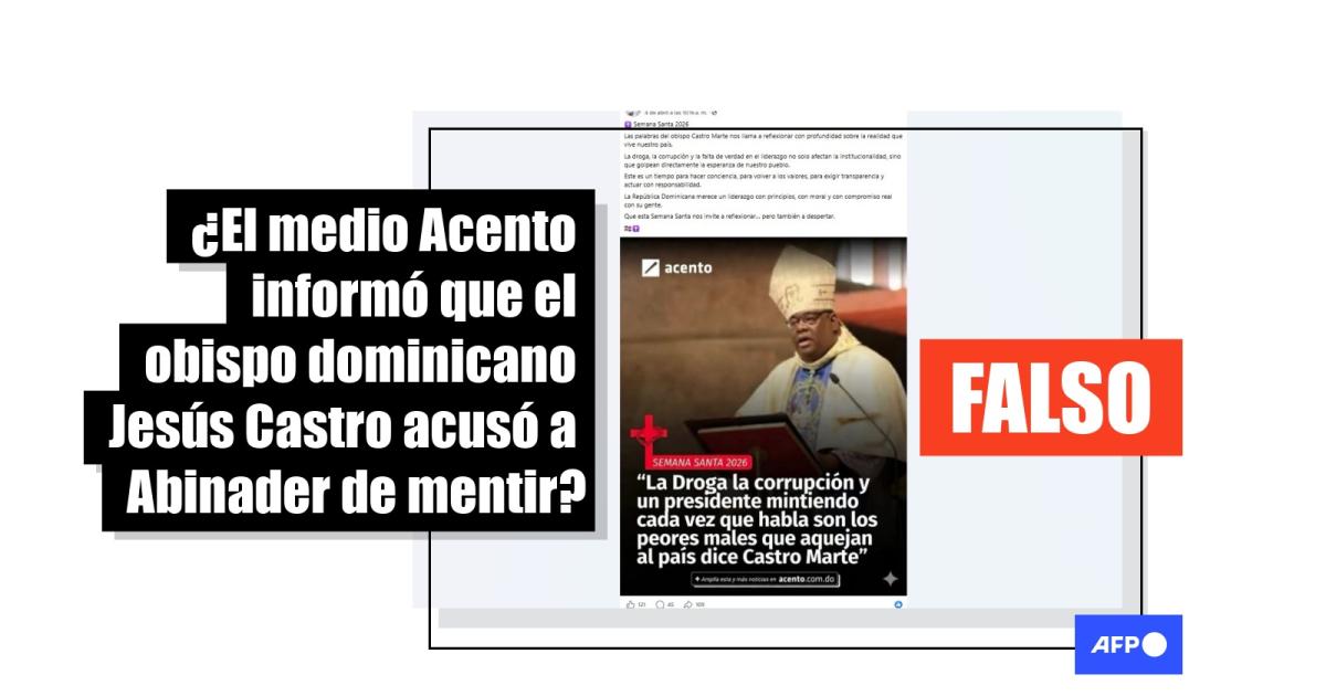El obispo dominicano Jesús Castro Marte publicó en su cuenta de X mensajes dirigidos a los políticos y la población de su país durante la Semana Santa. En ese contexto, desde el 4 de abril de 2026 se compartió más de 1.300 veces en redes sociales una imagen del periódico Acento con una fotografía del religioso junto a una frase en la que habría acusado al presidente Luis Abinader de mentir “cada vez que habla”. Sin embargo, se trata de una publicación del medio que fue alterada con inteligencia artificial (IA). Además, Castro y el diario desmintieron el contenido viral.