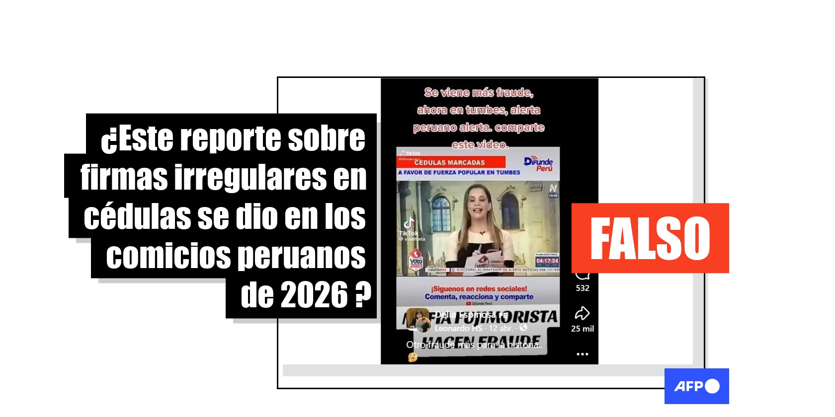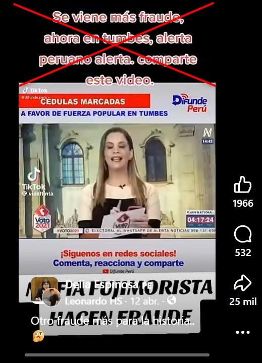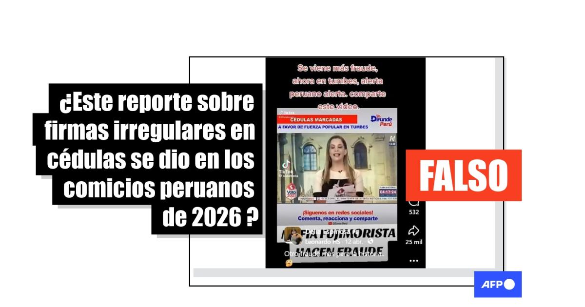 Las presidenciales del 12 de abril de 2026 en Perú se reanudaron al día siguiente tras fallas logísticas que impidieron votar a decenas de miles de electores. Al momento de esta verificación, en el conteo preliminar, Keiko Fujimori (Fuerza Popular) obtiene casi el 17% con el 56% de actas procesadas. En ese marco, circula en redes sociales un reporte televisivo sobre una mujer que habría firmado cédulas a favor de ese partido. El video circula más de 20.000 veces como un fraude ocurrido “ahora en Tumbes”, una localidad al noroeste del país. Sin embargo, corresponde a una denuncia en 2021.