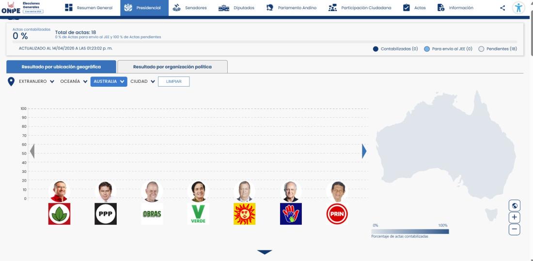 En la plataforma web de la ONPE, que ofrece una actualización en vivo de los resultados electorales, hasta el 14 de abril a las 13h00 de Perú aún no se habían contabilizado las actas de votación de los peruanos que viven en Australia.
