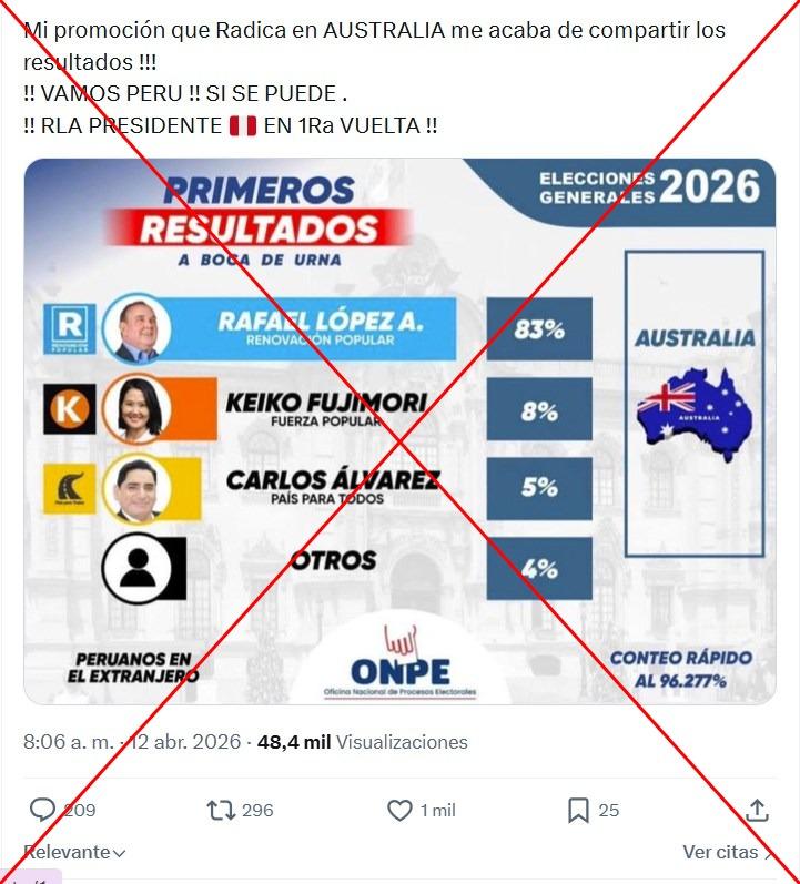 El 12 de abril de 2026, Perú realizó sus comicios generales, que estuvieron marcados por problemas logísticos. Antes de que culmine la jornada ese día, usuarios compartieron más de 300 veces en redes sociales que ya se conocían los “resultados oficiales” de la votación en Australia. Sin embargo, la Oficina Nacional Procesos Electorales (ONPE) confirmó a la AFP que los datos virales no son oficiales y que las actas extranjeras llegarían al siguiente día. Al momento de esta verificación, aún no se han contabilizado los votos de Australia.