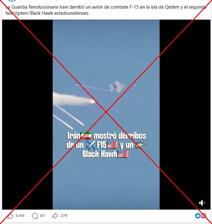 “La Guardia Revolucionaria Iraní derribó un avión de combate F-15 estadounidense en la isla de Qeshm”, dicen los usuarios que comparten el video en Facebook, Instagram, TikTok y X.
