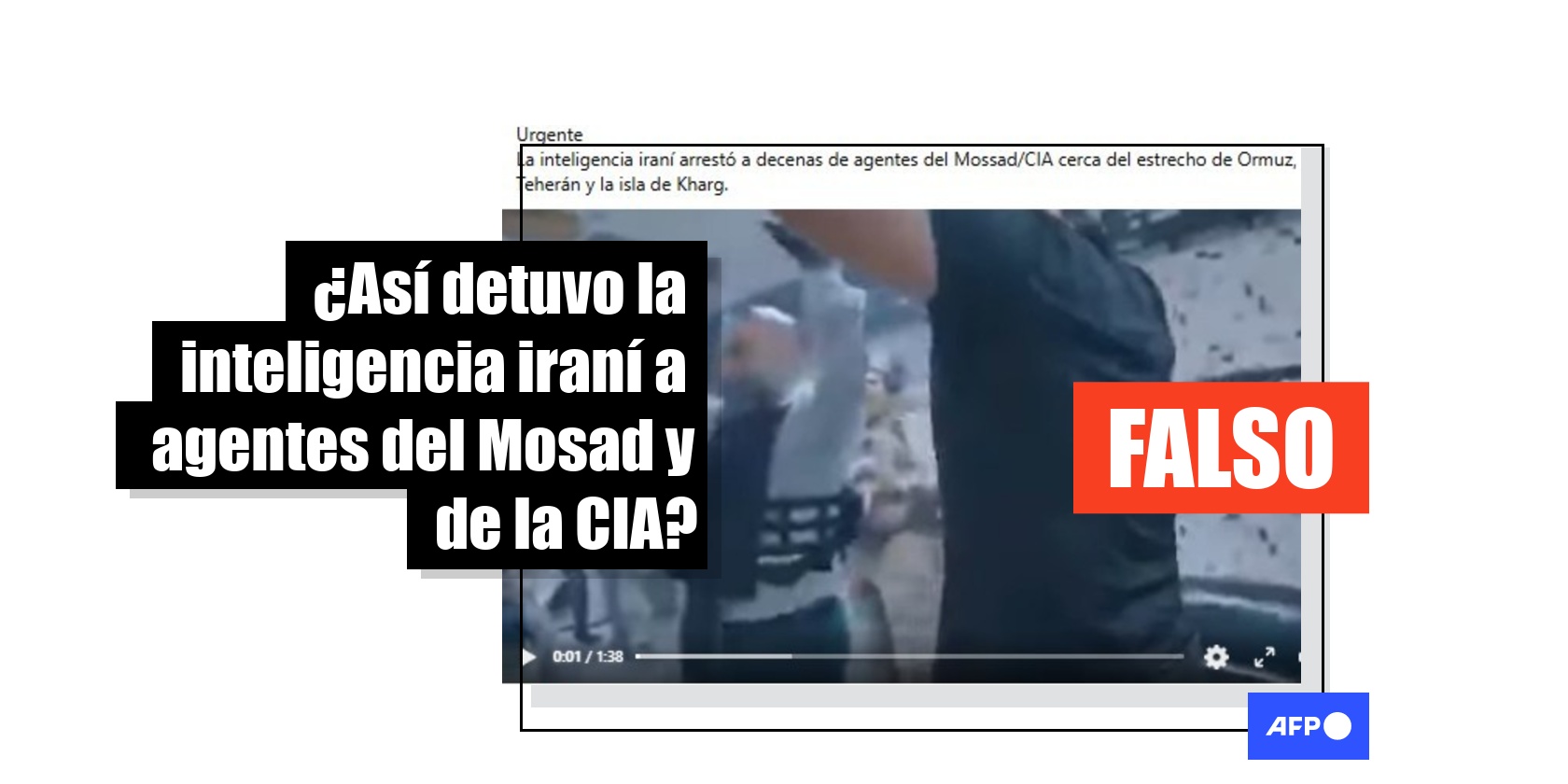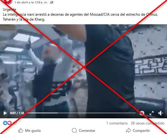 “Urgente. La inteligencia iraní arrestó a decenas de agentes del Mossad/CIA cerca del estrecho de Ormuz, Teherán y la isla de Kharg”, dicen publicaciones en Facebook, Threads y X, que comparten un video que muestra el arresto de varias personas en una primera escena. En la grabación también se ve el rescate de rehenes con granadas en las manos y al final varios espectadores y un supuesto periodista aparecen en la calle.