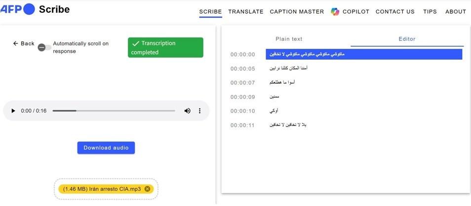 A partir del segundo 54 de la grabación, un uniformado comienza a hablar. AFP Factual extrajo el audio de la secuencia y, con la herramienta AFP Scribe, confirmó que el idioma que hablan es árabe y no persa, el idioma oficial de Irán.