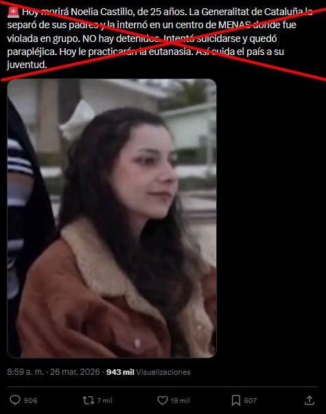 Un mensaje en X afirma: “Hoy morirá Noelia Castillo, de 25 años. La Generalitat de Cataluña la separó de sus padres y la internó en un centro de MENAS donde fue violada en grupo. NO hay detenidos. Intentó suicidarse y quedó parapléjica. Hoy le practicarán la eutanasia. Así cuida el país a su juventud”.