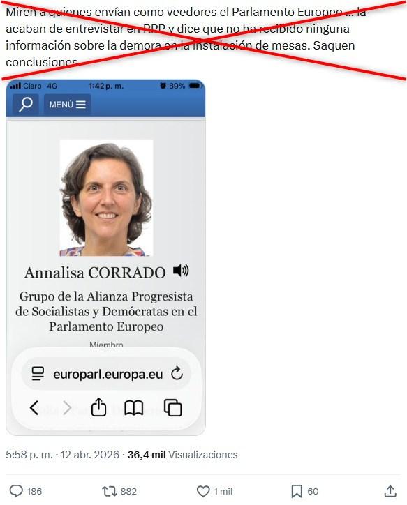 Las elecciones generales del 12 de abril de 2026 en Perú se vieron marcadas por retrasos en la apertura de mesas, que obligaron a extender las votaciones hasta el día siguiente. En ese clima, en redes sociales se difunde que Annalisa Corrado, jefa de la Misión de Observación Electoral de la Unión Europea (UE), dijo al medio RPP Noticias que no recibió “ninguna información” sobre las demoras en abrir las mesas de sufragio. Sin embargo, la narrativa, compartida más de 800 veces, es falsa: la eurodiputada reconoció este incidente en su intervención.