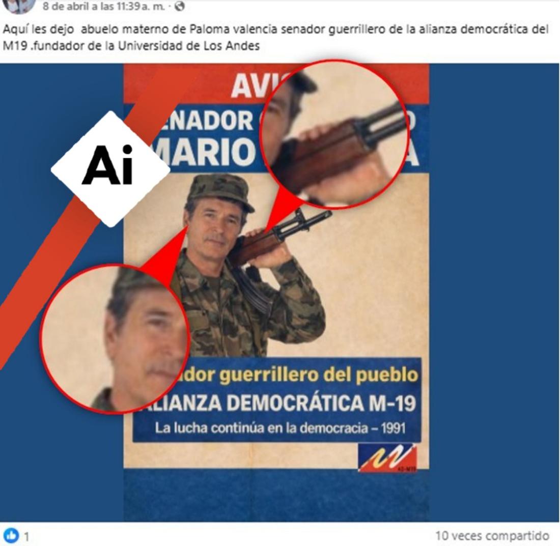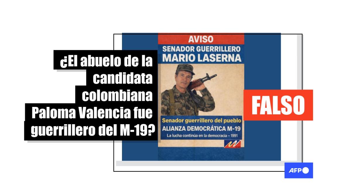 Paloma Valencia es una de las candidatas opositoras de las elecciones presidenciales que se celebrarán el 31 de mayo de 2026 en Colombia. En el marco de la campaña, desde el 8 de abril, circula una foto de su abuelo, Mario Laserna, con un fusil, junto a la afirmación de que fue un “senador guerrillero”. La publicación ha sido compartida más de 450 veces. Pero la foto es un montaje y, aunque Laserna fue congresista del partido creado por excombatientes de la guerrilla M-19, no formó parte de la etapa insurgente.