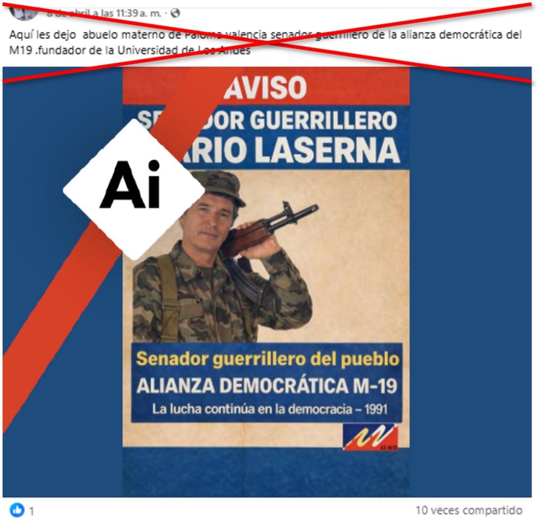 “Aquí les dejo abuelo materno de Paloma valencia senador guerrillero de la alianza democrática del M19 fundador de la Universidad de Los Andes”, señala uno de los mensajes difundidos en Facebook (1, 2), X e Instagram acompañados de una fotografía de Laserna vestido de camuflado y sosteniendo un arma.